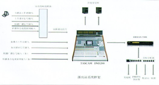 我台目前播出量为每天十六小时,除去每天四小时的直播和两个半小时的转播,其余九个半小时均为录播节目,因此从节目制作需求方面考虑,配置了三个音频录制站点。除了调音台的型号和直播台不一样之外,其余周边配置如播音员话筒、CD播放机、监听音响、监听耳机等都相同。而整个录制的核心设备则选用了TASCAMDM3200 48轨数字调音台,它有16路带高品质放大器的HIC、线路输入,两路S/PDIF或AES/EBU数字输人,它还为音乐制作者提供了丰富的数字效果音效,既简化了周边设备也让文艺录制变得更为轻松。