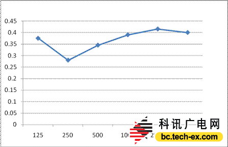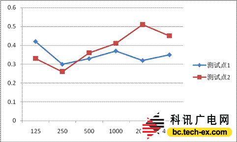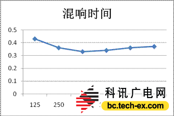 图13为控制室两个测试点的混响时间曲线,从图中可以看出调音台录音师位置的混响时间曲线较为平直,主要集中在0.3-0.35s附近,只是在125Hz附近有0.42s的混响时间,可能是隔声窗的反射面共振所致。而在控制室中心位置高频混响时间较高,中低频部分与测试点1类似,而高频部分相对较高,有可能为房间内家具及柜子玻璃的反射面所致,原因需要进一步排除才能确定。