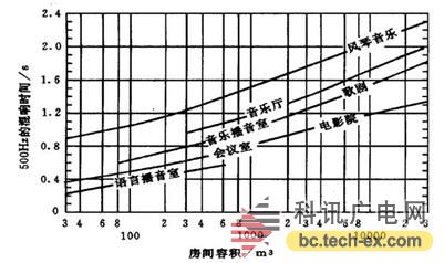 对混响时间进行计算,由此可见混响时间和建筑物的体积V,房间吸声材料的平均吸声系数