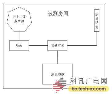 通过上面我们对混响时间的了解,利用脉冲响应积分法进行测量,其系统可分为声源、测试话筒、测量软件三部分,如图2所示,为脉冲响应积分法测量混响时间的测试系统图。声音信号通过电脑经声卡由正十二面体点声源扬声器发出,通过对房间的激励在测量点由测量话筒记录到电脑,经专业测试软件进行数字信号处理,最终获得混响时间。为了更好地激励房间的声学特性,通常测量时对声源及话筒有一定的要求,其中扬声器的指向性应尽可能接近全指向,且可以提供足够的声压级来满足声压衰减的动态要求,同时对于测量话筒来说振膜越小越好,最大直径不能超过26mm。