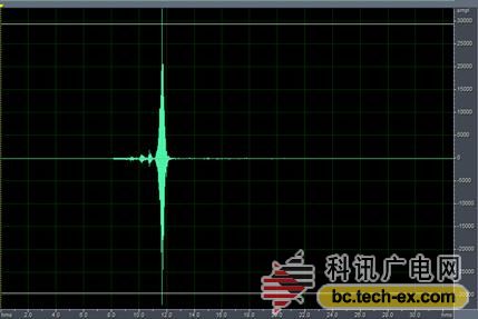 图3为扫频信号,作为房间激励的噪声信号,频率为20Hz-20KHz时长为10s,通过该信号与自身的卷积可以获得脉冲信号,如图4所示,从图中可以看出经计算得出的脉冲响应上升沿陡峭,比直接利用电火花或者扎气球等方法获得的脉冲响应频带宽且信噪比高。