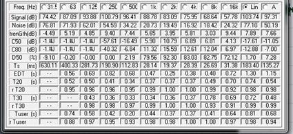 图5为话筒在测试点实际记录的扫频信号波形,我们从中可以看出不同频率在该点的振幅不同,并通过与原始扫频信号的反卷积获得冲击响应波形,如图6所示,前两个小波峰是由于算法问题导致的不影响我们对房间冲击响应做出判断,只要关注最大的那个脉冲就是房间的脉冲响应。通过计算可以获得房间的声压衰减平均曲线如图7所示,声压从0.58s的位置开始衰减,最终获得的混响时间如表1所示,不但可以获得混响时间T20、T30的参数,同时还可以计算得到C50、C80、EDT等众多声学技术参数,如图8所示为房间混响时间,其混响时间从125Hz-4000Hz基本在0.35s附近,且房间的混响时间较为平直。