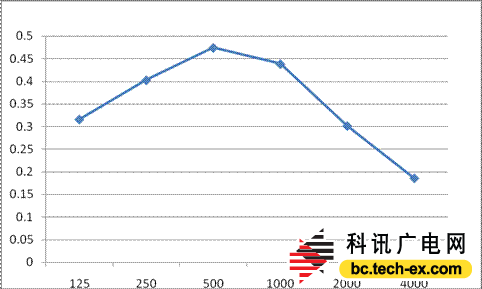 通过测量录音棚的混响时间曲线如图10所示,从图中可以看出房间在2000Hz-4000Hz之间混响时间较短,分别为0.3S和0.18S,同时在125Hz及250Hz的混响时间也相对较短,分别为0.3S及0.4S,在中频500Hz、1000Hz有着相对较多的混响时间。从整体上看该房间的混响时间特性存在一定的问题主要表现在高频吸声过多,中频混响时间过于突出,势必影响到主观的听觉感受,其本底噪声在关灯及关门的情况下测得为35.5dBA。