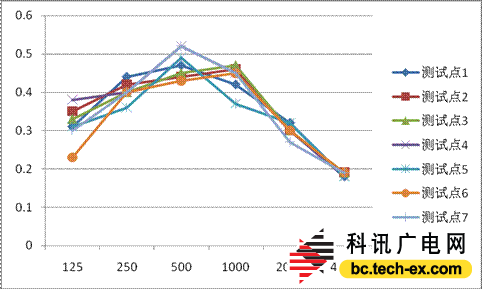 图11为录音棚内各个测试点的混响时间曲线,从整体来看7条曲线整体趋势基本相同的,特别是在2000Hz-4000Hz之间有着非常接近的曲线拟合。其中测试点7在500Hz偏离较大,主要原因可能在于测试点门及谱架等反射面形成的低频驻波所引起的共振。