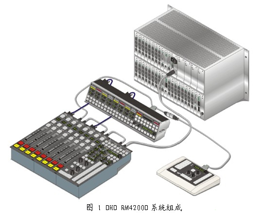DHD RM4200D调音台系统主要由2部分硬件组成:主机机柜,输入、输出、控制系统和DSP(Digital Signal Proceessing数字信号处理);控制台面(调音台),推子、按键和显示系统。两部分由一个工业标准的CAN BUS总线连接。因此,所有的单元可以相互单独存在,其间没任何复杂的配线连接。主机机柜在没有控制台面的情况下,也可以作为一个单独的装置独立工作。整个系统采用了高度模块化技术,可以利用系统提供的PC软件设置,并保存在自己的系统里,PC机不参与日常的操作,需要改动设置时,利用RS232、RS422或RJ45接口连接上PC机即可设置。