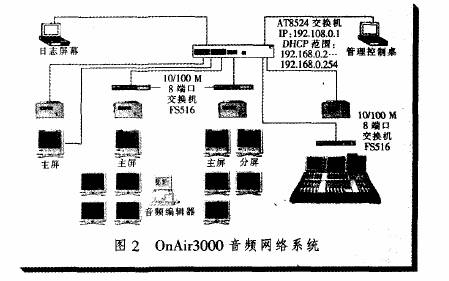 为了尽可能发挥OnAir3000在音频网络中的作用,在组网时必须选择合适的网络拓扑结构。为保证充裕的带宽和较低的响应时间,MADI技术应用于音频信号的输人输出,而直播机房和总控机房之间的互连则通过五类线连接。