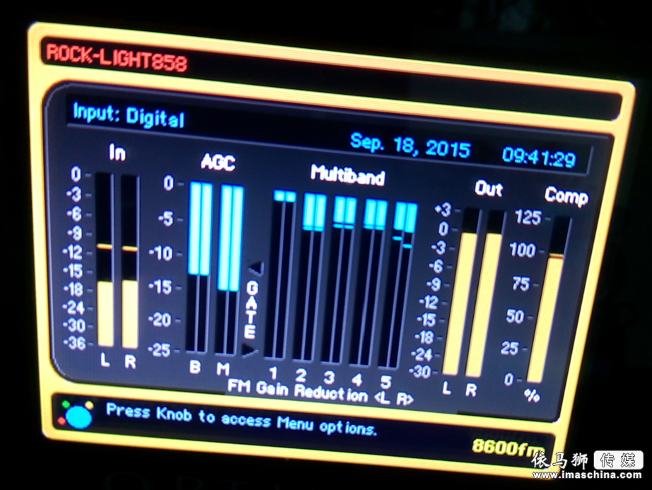 1.该设备用户界面友好,参数设置、调整方便。具有模拟和数字两种信号输入输出,内有八个工厂预置:①Classical-Protect产生很清晰的,开阔的声音。②2B General Purpose提供一个平均的处理。③Talk谈话类节目处理模式。对于新闻,热线电话互动节目,采访类节目以及其他语言类节目。Talk保持播音员和嘉宾的的声音响度一致。并且在语言和广告节目之间保持一个适当的平衡。④Music-Light产生一个很开阔的、未经压缩(修饰)的声音。⑤Music-Medium提供了介于Music-Light和Music-Heavy之间的处理系统。⑥Music-Heavy提供了强烈的刺耳的声音处理。⑦Music-Bass Medium产生一个很有动感,清晰,开阔的声音。⑧Music-Bass Heavy提供强烈带有附加低音动感的处理。预加重50µs的预置[2]:按System setup键,显示屏上显示的Stereo Encoder下面所对应的按钮按下,再将显示屏上显示的Proc Pre-e下面所对应的按钮按下,显示屏上会出现预加重时间常数50µs、75µs,此时就可以利用飞梭旋钮选择50µs预加重时间常数。