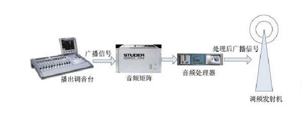 在广播播出系统主要利用音频处理器解决音频信号电平时大时小的问题,使输出信号的电平保持稳定和和解决信号电平的动态范围。调频广播中音频处理器的应用,一般接在调音台播出之后,发射机前,我台把音频处理器串联在播出链路的最后一级,在调频发射机之前。这样有效地解决了播出系统声音怱大怱小的问题来获得最佳音质。如图3所示。