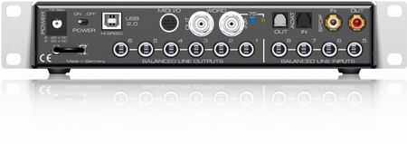 正面的1,2路输入没有区别,都是多用的,既可以插话筒的卡农接头也可以插大三芯作为线路输入。3,4路输入既可以插普通大三芯也可以插电吉他电贝司等乐器。看上去似乎没什么特别的,但是重点在于两个MIC输入,UCX采用了同UFX相同的话放单元,该单元使用了RME Micstasy的核心技术(并行转换技术——每个话放单元采用两个模数转换器进行并行模数转换,由此可获得更佳的信噪比及宽动态),能够进行65dB的数字增益控制(1dB为最小调整单位,较大调整范围55dB)。这给UCX带来了更好的音质。