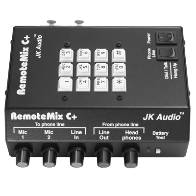 RemoteMix C+集音频调音台、耳机放大器和电话耦合器于一身。适用于远程广播、运动会以及各种外景的现场报道。只需将RemoteMix C+连接到一个模拟电话线路上,在连上几个话筒和耳机,现在你就可以对着电台说话了。将“电话线路”开关调到“拨号/通话”,你会听到拨号音。这时就可以使用RemoteMix C+的键盘拨号了。
