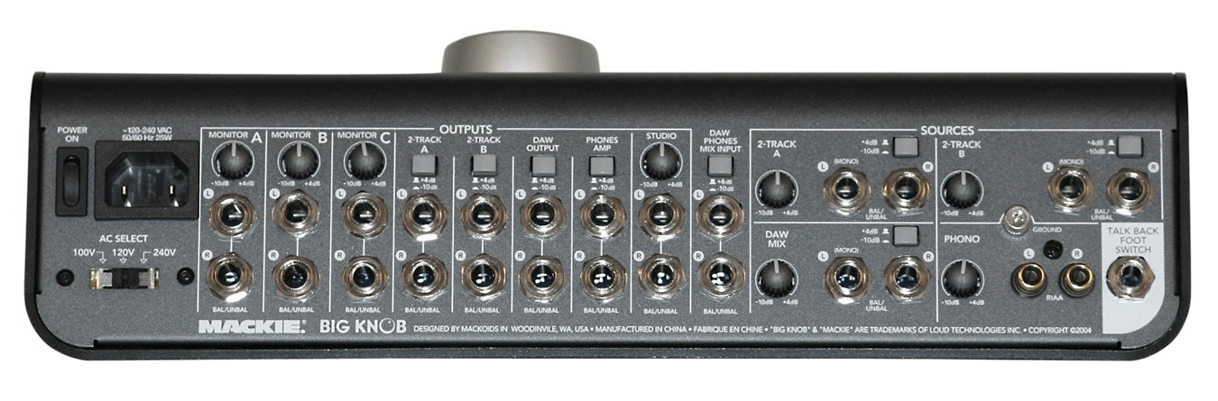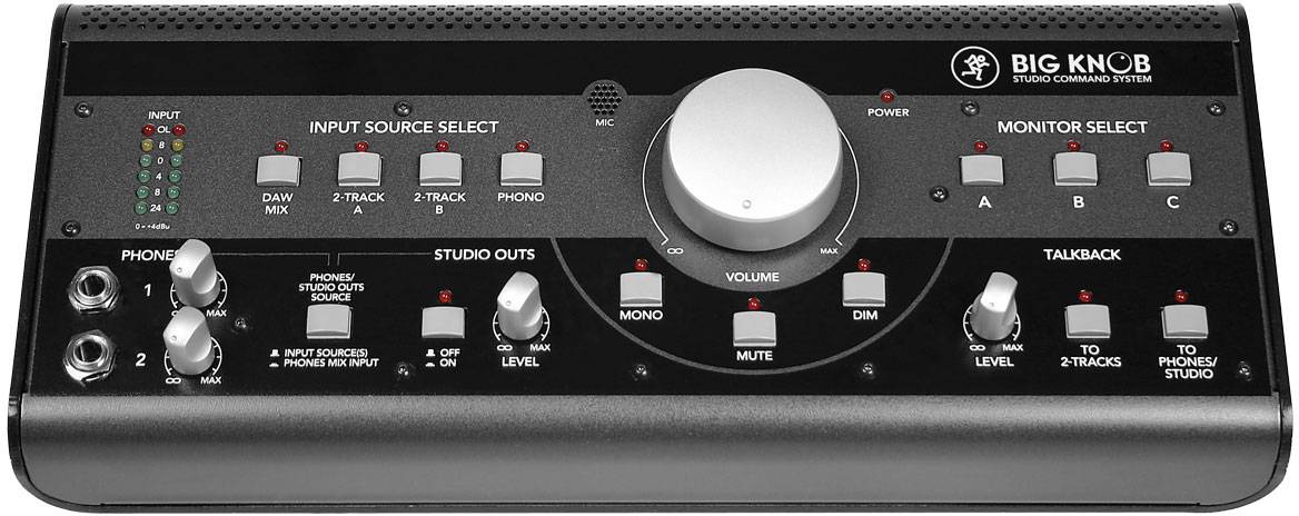 Mackie公司的录音室指令控制器Big Knob,是一款及监听电平、控制监听、切换监听、听源选择、录音室对讲双监听、耳机输出唱机于一体的前置放大器。