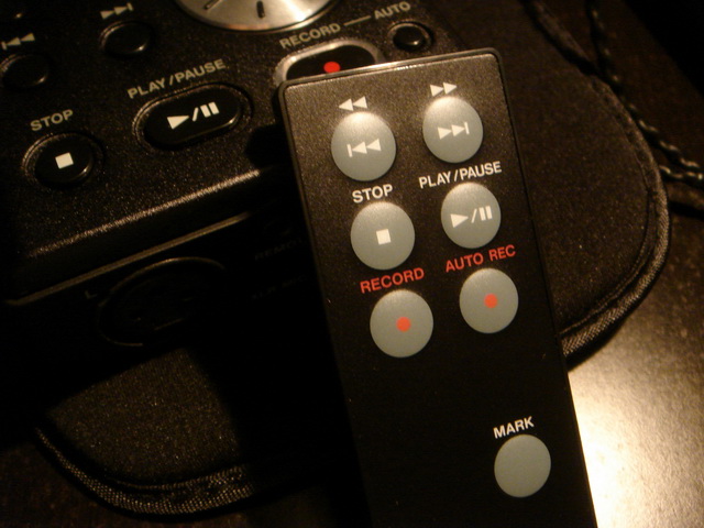 DR-100附带的无线遥控更是一大优势,值得着重一提。这个小巧的遥控可以控制播放\暂停、停止、前后选曲\快进后退、录音、分曲,涵盖了最常用的功能,你可以把DR-100放在包里,用遥控来控制常规回放,在公车,地铁里也不必在意别人异样的眼光,做到足够低调。而且这个无线遥控可以通过附带的线控适配器,从无线变为有线控制,适应不同的使用场合。就我自己的使用经验而言,这个无线遥控在3m内对机器遥控没有问题,只需将遥控对准机器顶部的接收器位置即可。从此不用频繁的将砖头拿在手上选歌了,这个遥控非常有实用价值。SONY为D50配的遥控不光是线控不说,功能少,售价还要2百多元,真是坑爹。。