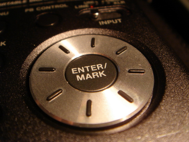相信第一眼看到DR-100的面板,都会注意到那个显眼的银色圆形转轮,这个转轮是TASCAM一系列机器上的一大特色,大多数功能都可以用过这个转轮和中间的按钮实现操作,特别是在选择文件夹、曲目、播放速度时,这个转轮有着无可取代的作用。铝合金车制而成,上面嵌镶着塑料防滑条,很精致,很实用。个人实用下来,要说有什么不足,就是阻尼感差一些,不够圆滑,中间的圆形按钮对比其他按键,手感较松,按键感较差。这个转轮有24个刻度,拨动一个刻度就可以快进或者倒退1秒,方便对文件进行精确定位。