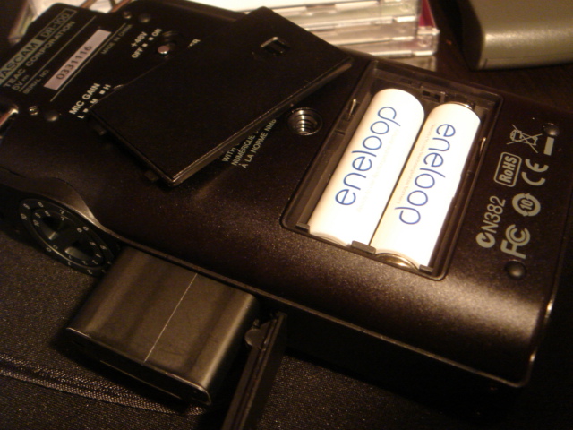 DR-100采用混合电源解决方案,可以同时装入锂电池和2节AA电池,但实际上这2种电源不是同时使用,你可以在菜单内选择主电源是锂电池或者AA电池,剩余一个则作为备用电源,使用时会先耗尽主电源的电量再自动转到备用电源。这样的好处是在你录音或者回放时不用关机更换电池,可以在开机状态下轮流更换电池,保证使用时的持续性。标配的锂电池可以使用5小时,2节充电电池可以使用4小时,总共使用时间是9小时。个人觉得这种混合电池方案有利有弊,锂电池总有失效的一天,到时只靠2节aa电池供电,续航时间会比较短,虽然可以多备电池轮流更换,但一天更换2次电池还是会有点不便,D50那种全采用5号电池的供电方案我更喜欢一些。