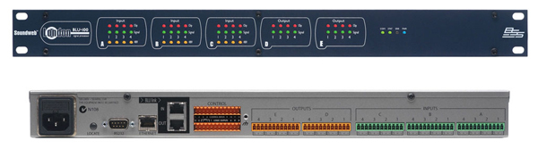 带如同其他型号的Soundweb London设备一样,12个逻辑输入控制和6个逻辑输出控制可以让BLU-100方便的兼容GPIO设备。后面板的RS-232端口可以让BLU-100与第三方控制设备完美结合,也可以简单的控制一些第三方设备如投影机,显示器,灯光控制设备等。以太乙网端口除子用于配置连接、控制和监测,还可以用于一些使用IP控制协议的第三方控制系统中。
