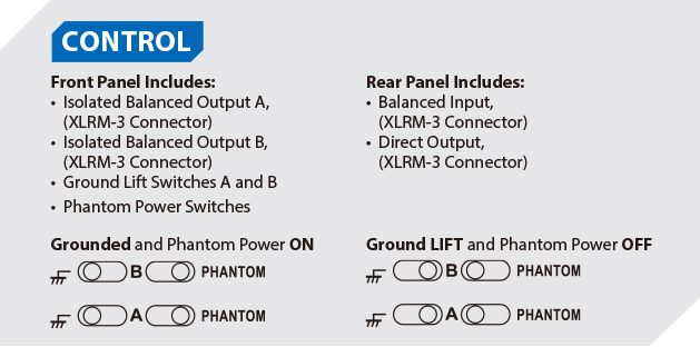 分配器设有三组输出 - 1 组直接输出、2 组变压器隔离输出,每组输出端均可同时为话筒连接幻象供电工作。而 2 组变压器隔离输出 (A及B) 同样设有地线连接开关,可帮助解决因地线回路产生的噪音。将开关推向右时,地线会设于分离状态;将开关推向左时,地线会设定为连接。另外 A 及 B 输出均设有幻象供电开关,可个别控制不同调音台到话筒的幻象供电安排。