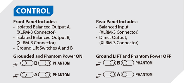 线路分配器的每一通道均分别设有三组输出:1 组直接输出、2 组变压器隔离输出、而该 2 组变压器隔离输出 (A及B) 亦同样设有地线分离选择开关,可帮助解决因地线回路产生的噪音。将开关推向左时,地线会设定分离;而将开关向右时,地线将会设定为连接。