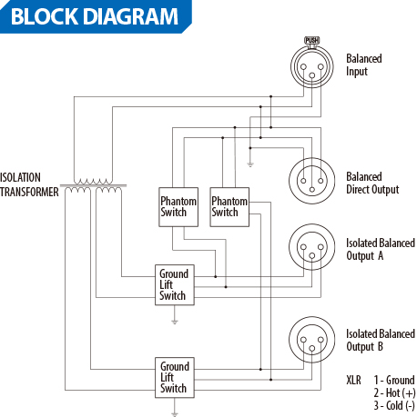 分配器设有三组输出 - 1 组直接输出、2 组变压器隔离输出,每组输出端均可同时为话筒连接幻象供电工作。而 2 组变压器隔离输出 (A及B) 同样设有地线连接开关,可帮助解决因地线回路产生的噪音。将开关推向右时,地线会设于分离状态;将开关推向左时,地线会设定为连接。另外 A 及 B 输出均设有幻象供电开关,可个别控制不同调音台到话筒的幻象供电安排。