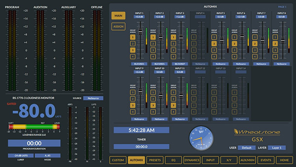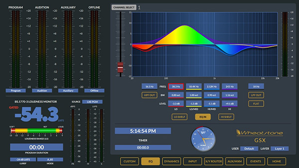 GSX无缝连接到WheatNet-IP智能网络,并利用BLADE在单根CAT6互连电缆上传输音频,控制和相关逻辑数据。该系统几乎可以提取和转换所有音频格式:麦克风和线路电平模拟,AES / EBU,SPDIF,AoIP,MADI,SDI甚至是AES67。包括响度测量,相位控制和完整的EQ / Dynamics。